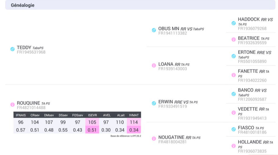 Très lourd (environ 850kg aujourd'hui), long, puissant et profond, avec des origines associant viande, croissance et qualités maternelles hors du commun (index lait grands parents : OBUS 129 / LOANA 102/ ERWIN 114 / NOUGATINE 107)